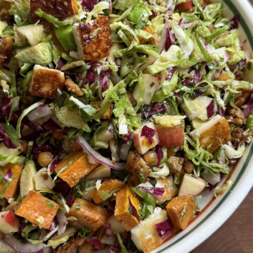 While there isn’t a direct substitution, if you’re having a hard time finding halloumi (or don’t want to splurge on it), feta would be a delicious replacement. You won’t sear it, but just crumble it into the salad as you would normally.